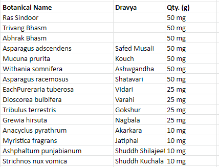 Indications : Aphrodisiac (vrushya) Rejuvenating,impotency, Increases Sperm Count, Strengthens The Reproductive System, Premature Ejaculation Etc