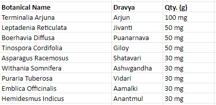 • Indications : Heart Tonic, Cardio Vascular Diseases, Cardiac Ischemia, Hyper Lipidemia, Hrdaya Roga, Hrdaya Daurbalyata Etc.